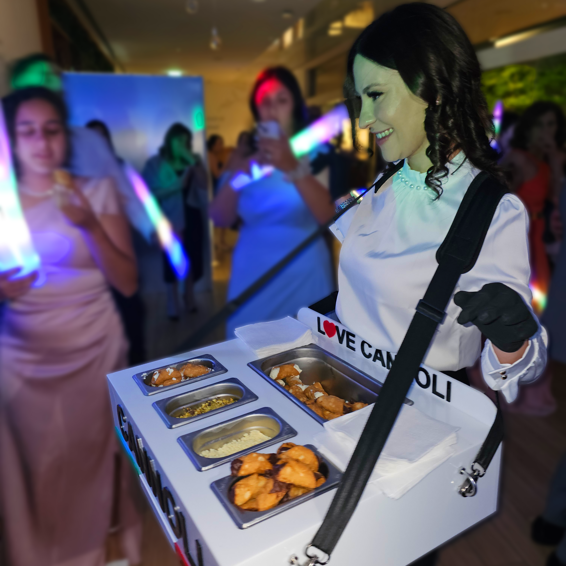 Perfect for weddings, birthdays, corporate events and intimate gatherings, the Roaming Cannoli Bar adds charm, movement and personality to your celebration. It encourages interaction, creates natural photo moments and brings a warm, inviting atmosphere that connects everyone through the universal joy of dessert.